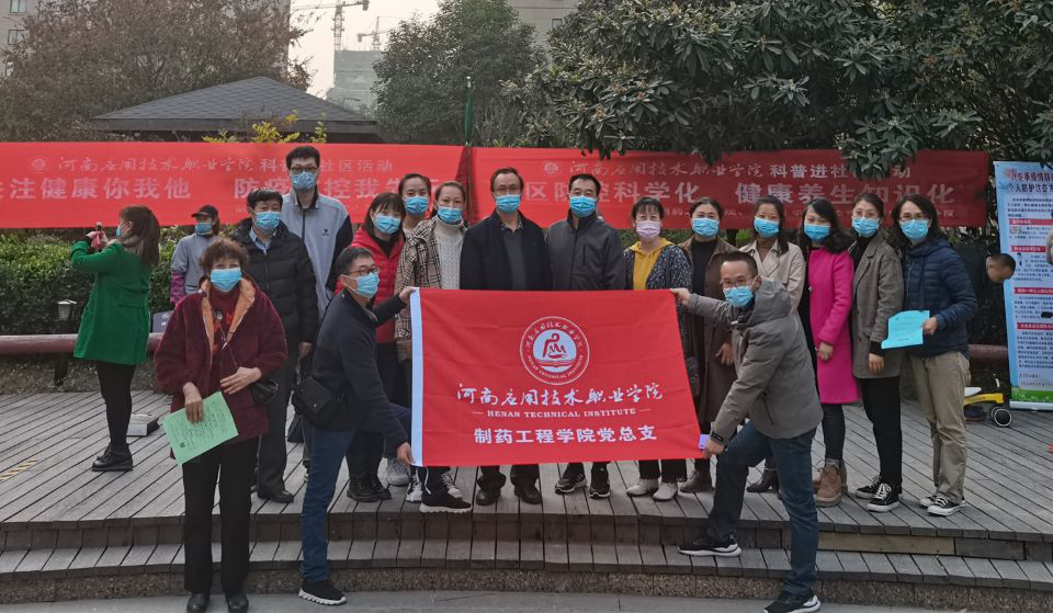 11月13日下午3点,制药工程公司全体党员教师和入党积极分子来到鼎立社区广场,开展了“社区防控科学化 健康养生知识化”的科普进社区党日活动。活动中,专业教师和员工志愿者们一边为辖区居民发放“用药小常识"宣传单、《秋冬季健康防护指南》宣传册,一边讲解个人如何搞好秋冬季防疫防控的注意事项,宣讲用药常识等内容,居民们听得非常仔细,志愿者们还耐心解答居民们提出的问题。