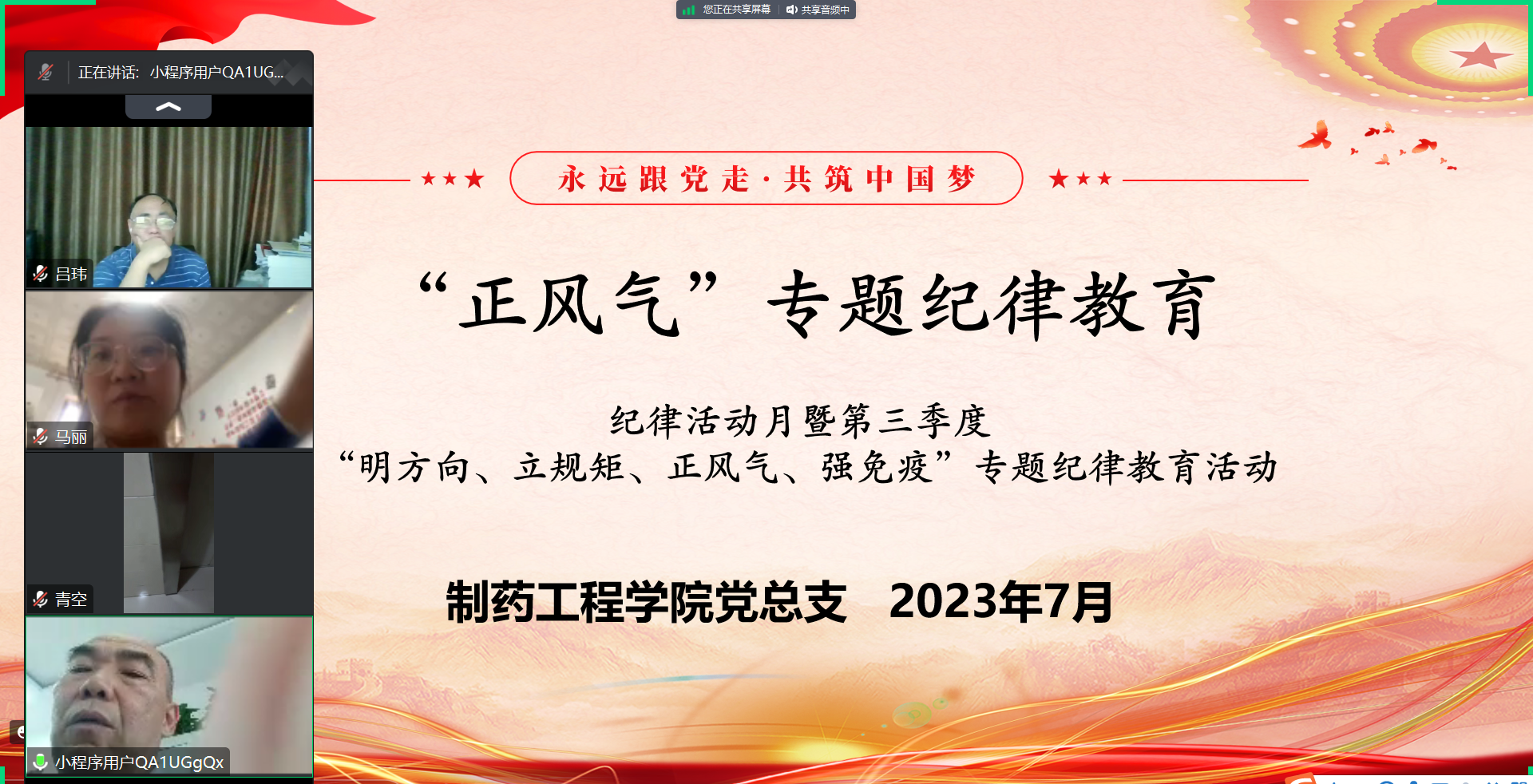 为深入贯彻党的二十大精神,落实关于一体推进“三不"、 廉洁文化建设和家风建设精神,强化党员干部的纪律、责任意识,切实筑牢拒腐防变思想道德防线,加强思想道德和党纪国法教育,推进廉洁文化建设,营造风清气正的公司产品环境,根据公司纪律检查委员会纪律教育活动月相关要求,7月23日,制药工程公司党总支组织开展了“正风气”专题纪律教育活动。会议由党总支书记窦传斌主持,公司全体党员线上参加了学习。