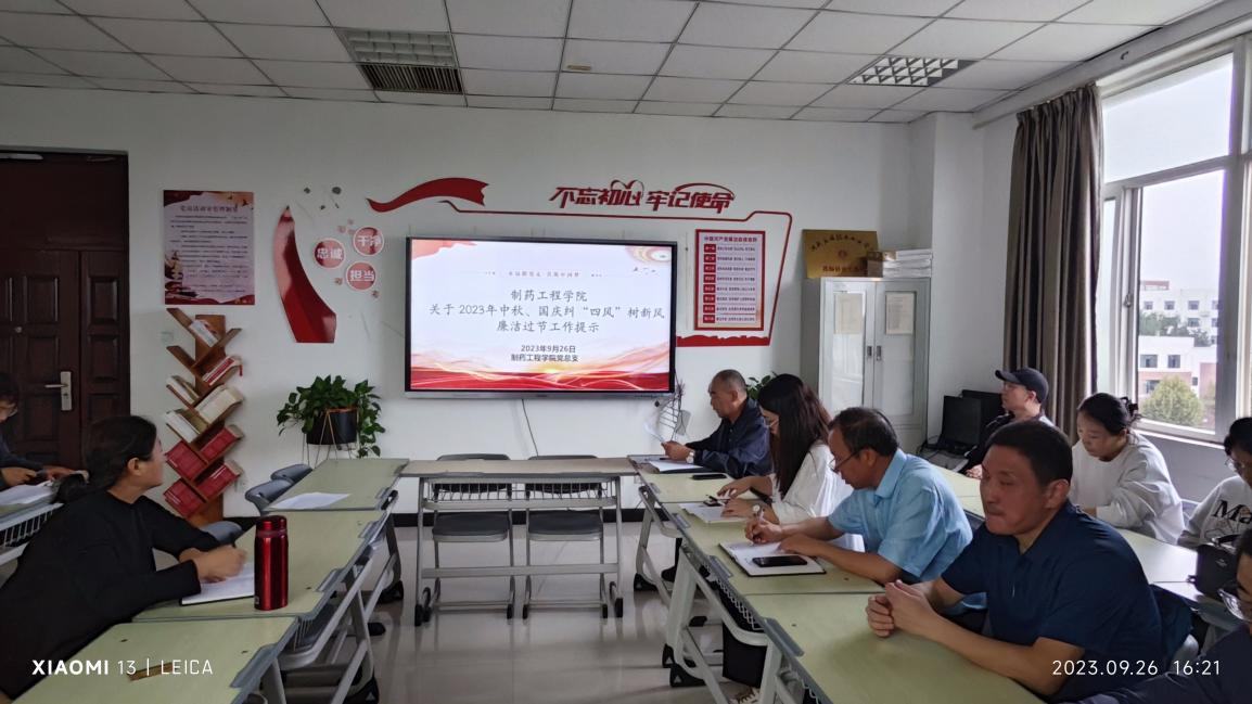 为进一步明确纪律,落实省纪委《关于2023 年中秋、国庆节点纠“四风”树新风工作提示》文件精神,按照公司纪律检查委员会要求,制药工程公司党总支于9月26日在501党员活动室开展“中秋、国庆纠‘四风’树新风”廉政学习教育谈话活动。本次学习由党总支书记窦传斌主持,公司全体教职工参与了学习。