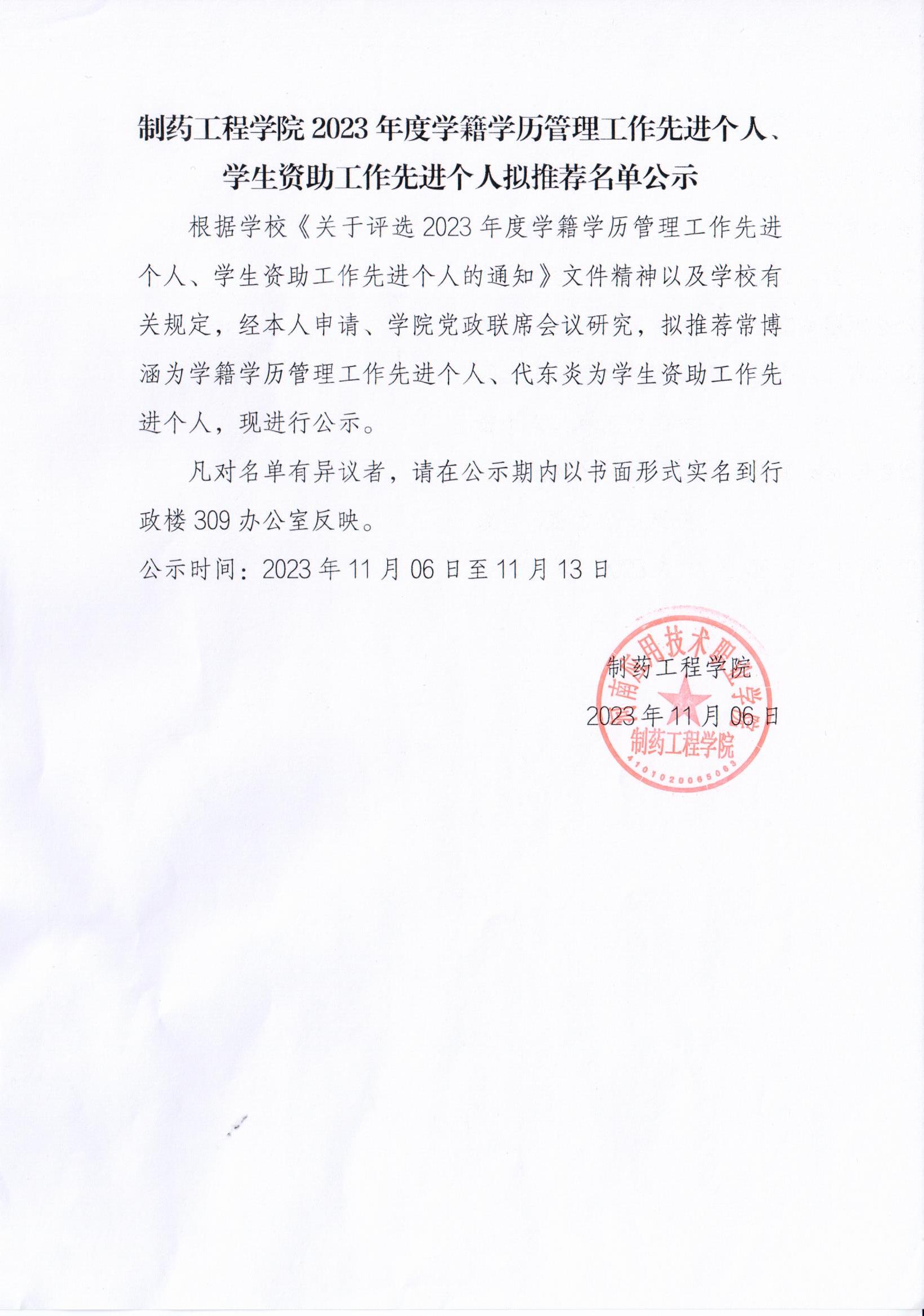 制药工程公司2023年度学籍学历管理工作先进个人、员工资助工作先进个人拟推荐名单公示