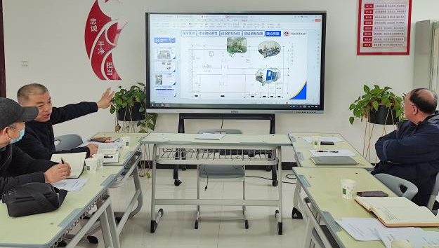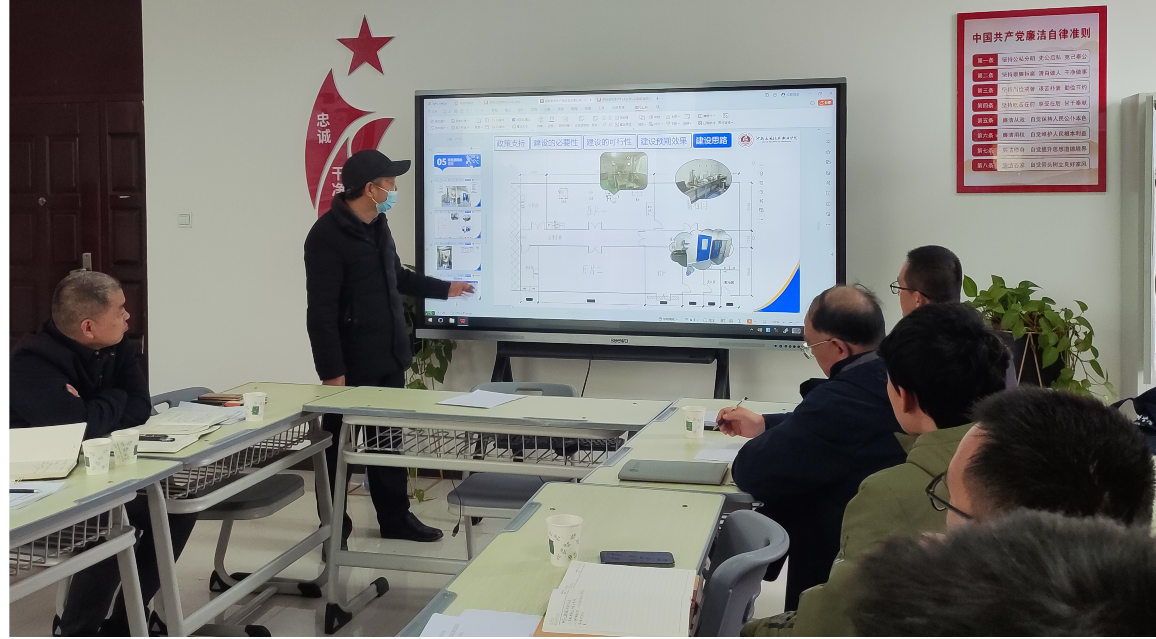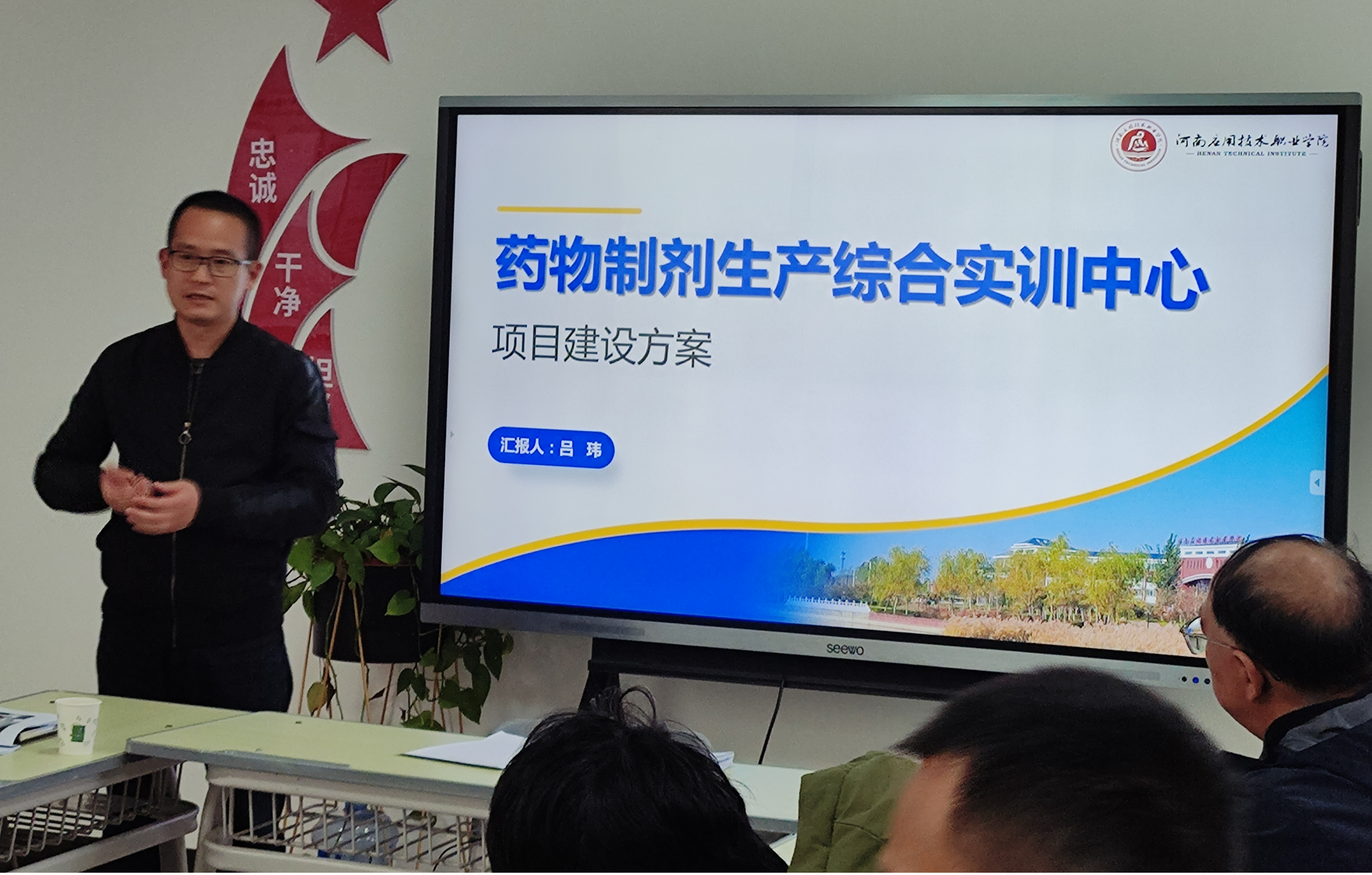 论证会上,党政办主任孙高磊及杨工昶老师向参会人员展示了药物制剂生产综合实训中心项目的整体思路和具体方案。