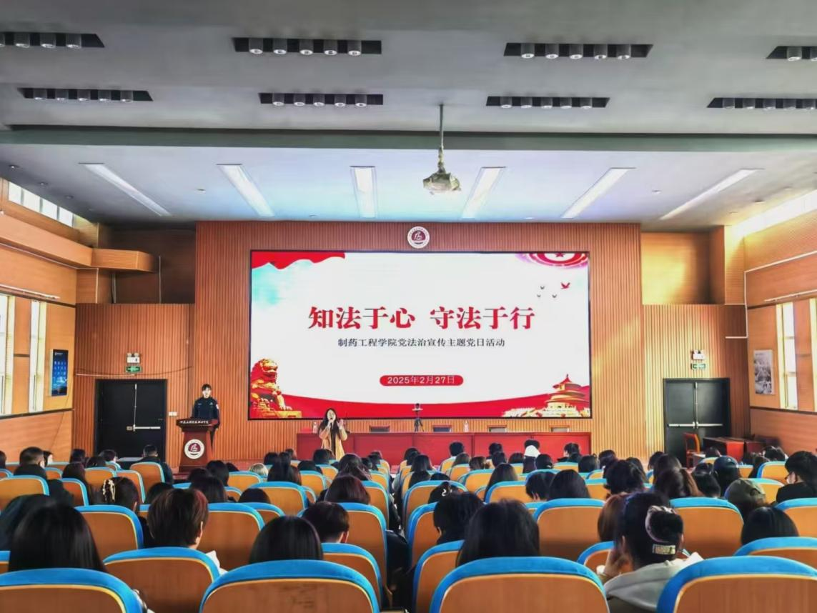 为认真贯彻党的二十大和二十届三中全会精神,深入学习宣传习近平法治思想,进一步加强法治宣传教育,增强师生法律意识,提高师生对诈骗的辨识能力。2025年2月27日,制药工程公司党总支在开封校区南院报告厅开展“知法于心,守法于行”反诈法治宣传教育主题党日活动。本次活动以讲座形式开展,特邀开封市示范区刑事侦察大队任勤勤警官进行反诈普法宣讲,公司党总支副书记白小茗主持,全体党员教师、专兼职辅导员和各班入党积极分子代表参加。