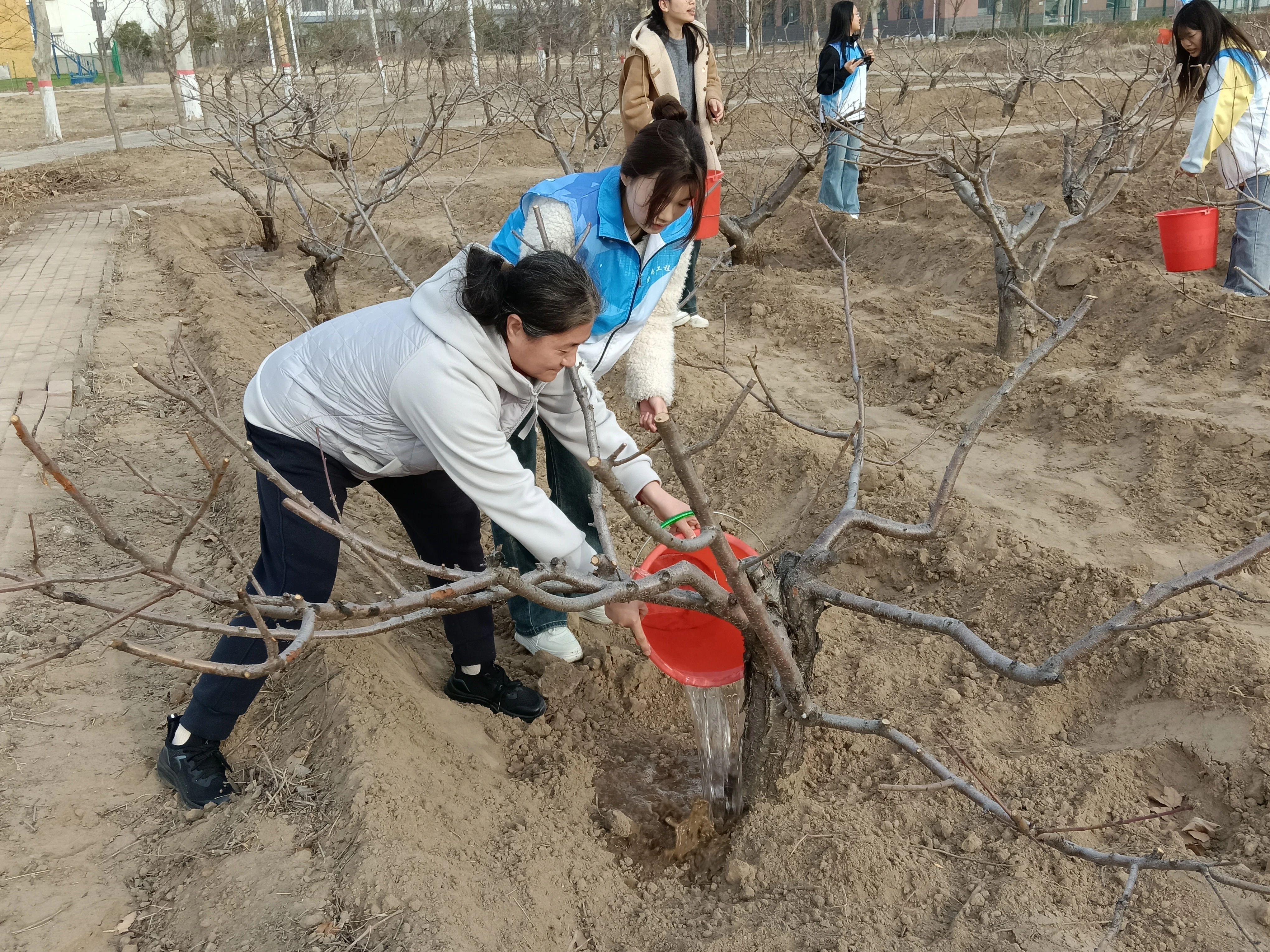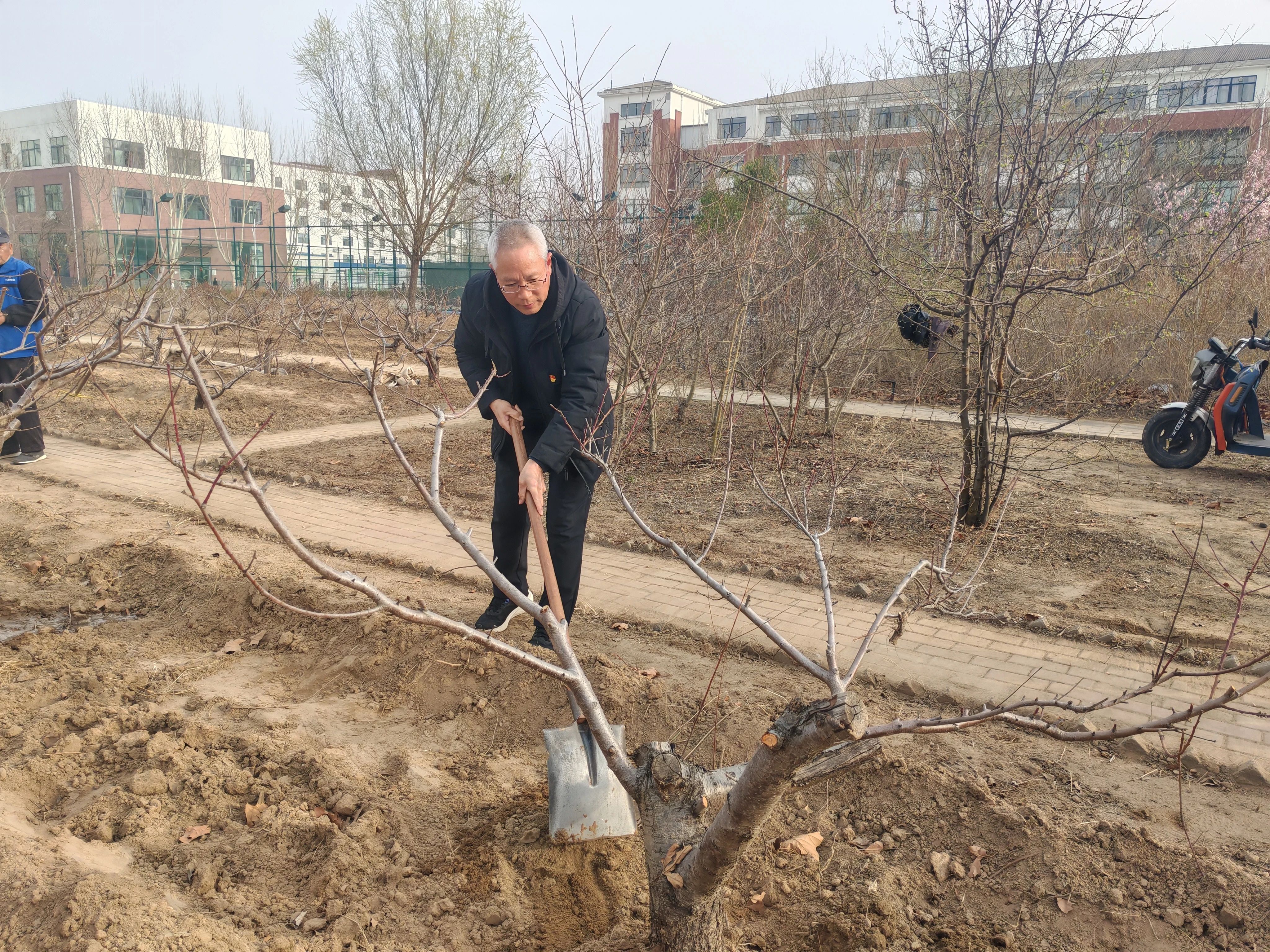 活动现场,窦传斌向大家详细介绍了树木的种类和相关知识,并讲解了植树要点和注意事项。党员教师协同志愿者,手持铁锹,铲土培根,细心扶正树苗,填土夯实,再提水浇灌,彼此间默契配合,共同将一棵棵充满生机的树苗植入大地。