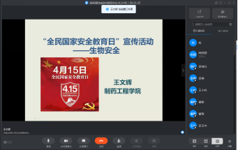 在第5个全民国家安全教育日来临之际,制药工程公司为增强公司师生的安全防范意识与知识,推进国家安全教育工作深入开展,增强责任感与应急判断力,于2020年4月14日下午,利用钉钉网络召开宣讲会,由王文辉老师为全院教师普及生物安全知识。在第5个全民国家安全教育日来临之际,制药工程公司为增强公司师生的安全防范意识与知识,推进国家安全教育工作深入开展,增强责任感与应急判断力,于2020年4月14日下午,利用钉钉网络召开宣讲会,由王文辉老师为全院教师普及生物安全知识。
