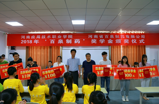 公司领导与百泉制药有限公司领导在奖学金颁奖仪式致辞中指出,校企合作拉开了人才培养新的序幕,给同学们施展才华、学习成材提供了新的舞台,希望同学们能够紧紧抓住这一机遇,努力学习文化知识、掌握专业技能,提升内在素质与修养,做到德智体美劳全面发展,积极拥抱新时代,力争成为合格的技术技能人才,为实现中华民族伟大复兴的“中国梦”做出自己的贡献!