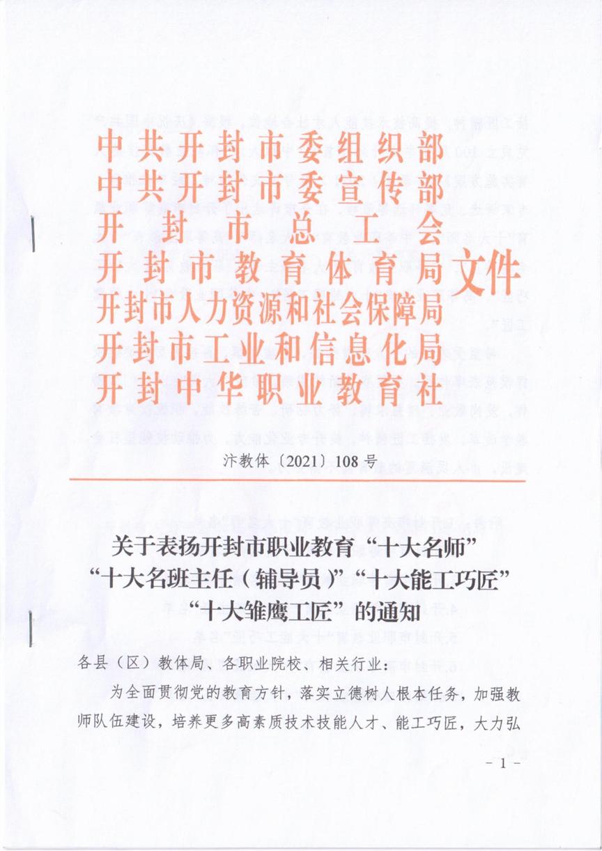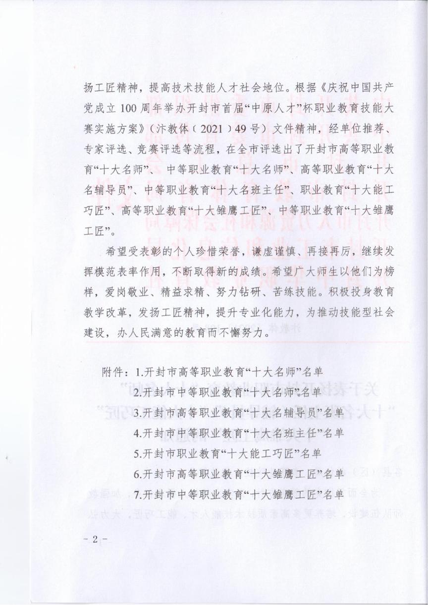 2021年12月16日,由中共开封市委组织部主办、开封市教育体育局承办的首届“中原人才”杯职业教育技能大赛颁奖仪式在汴梁小宋城举行,公司制药工程公司朱玉玲老师经过层层选拔和严格考核,被评为开封市高等职业教育“十大名师”荣誉称号。