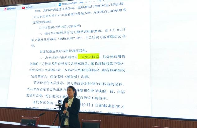 随后,薛静老师向实习员工及实习指导老师强调了相关注意事项,并安排实习班级与实习指导老师见面。希望同学们能够珍惜实习机会,认真对待每一个实习岗位,努力提升自己的职业素养和实践能力。公司也将继续加强与企业的合作,为同学们提供更多优质的实习机会和平台。