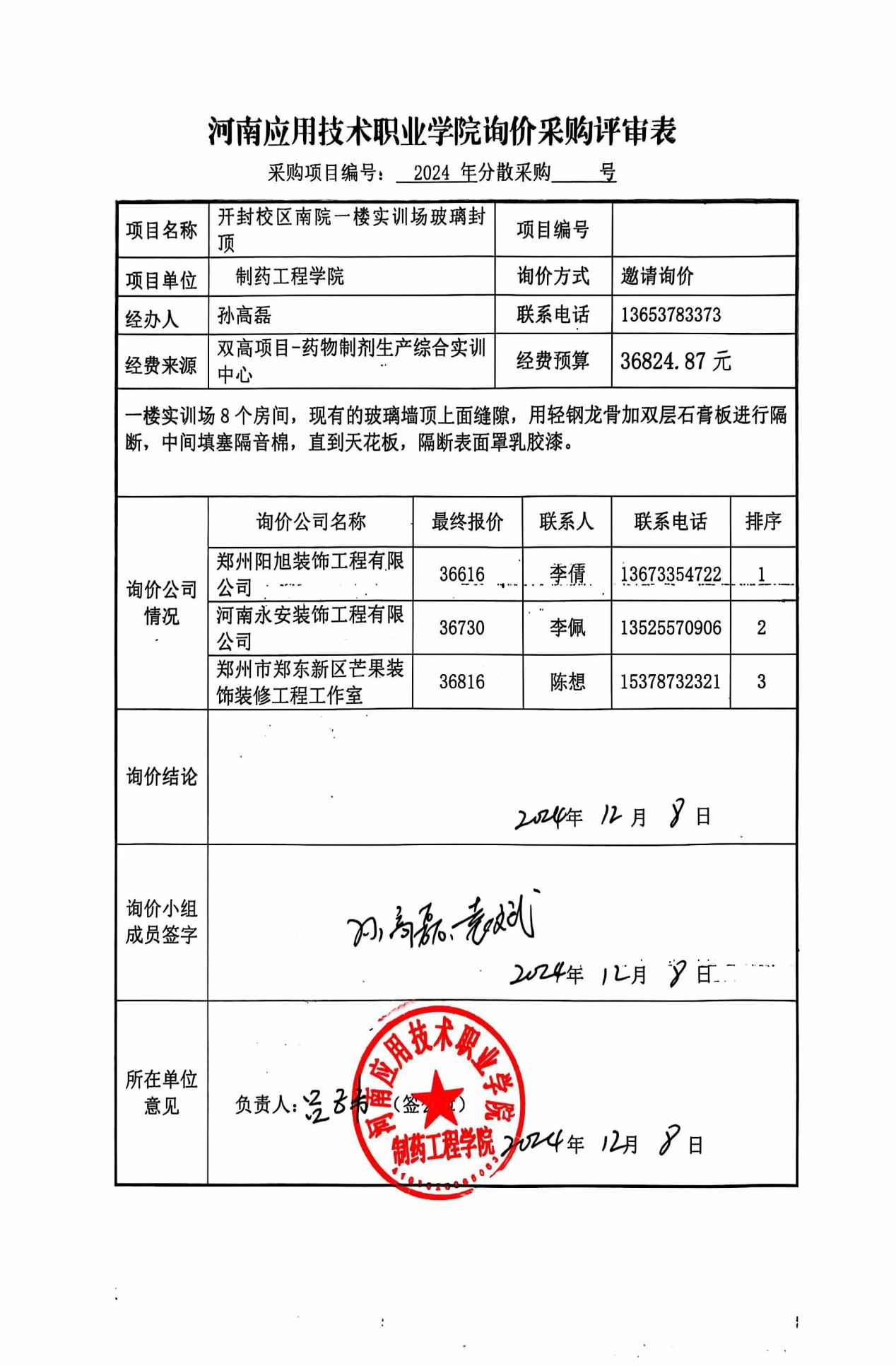 制药工程公司“实验楼一楼现有玻璃幕墙封顶项目”,于2024年12月8日10: 00(北京时间),在304永利集团公司开封校区(南院)301室,按照公司询价文件的规定,对3家供应商的响应文件进行了评审,现对评审结果进行公示。