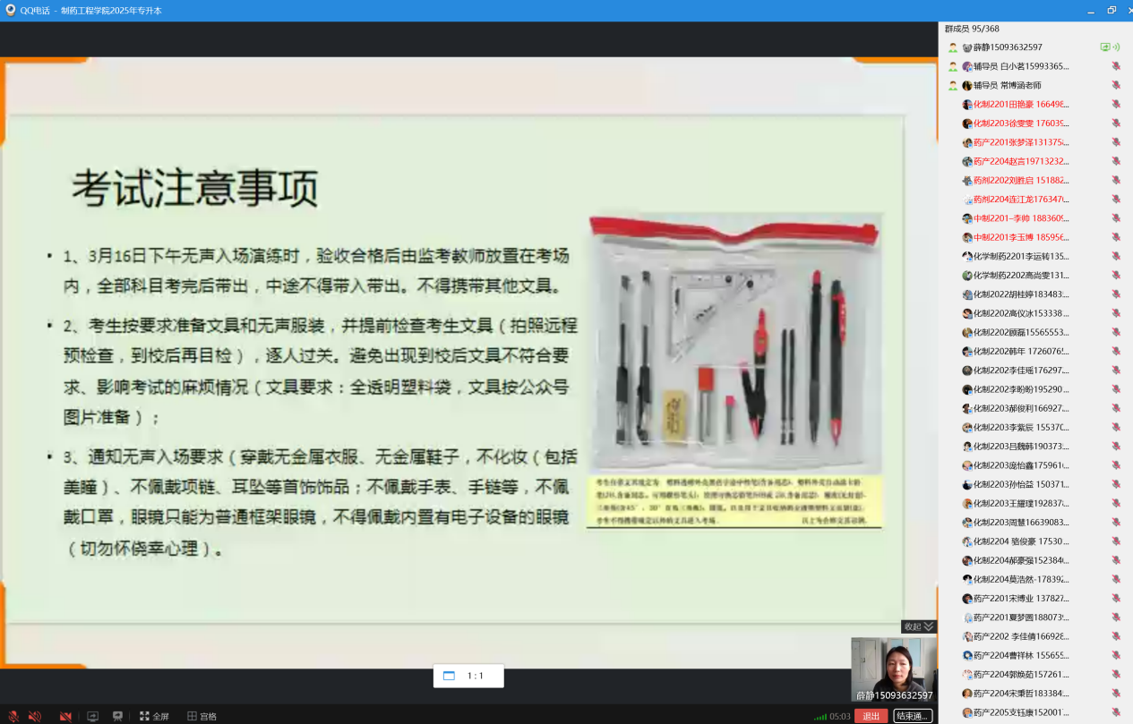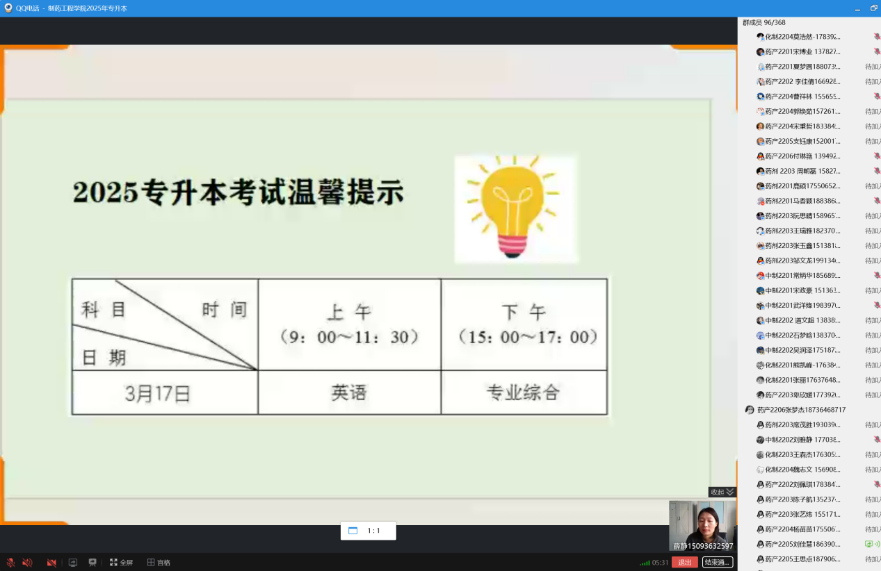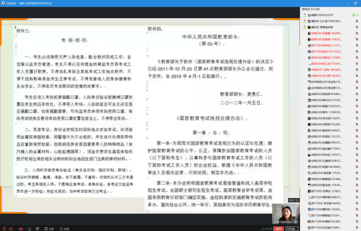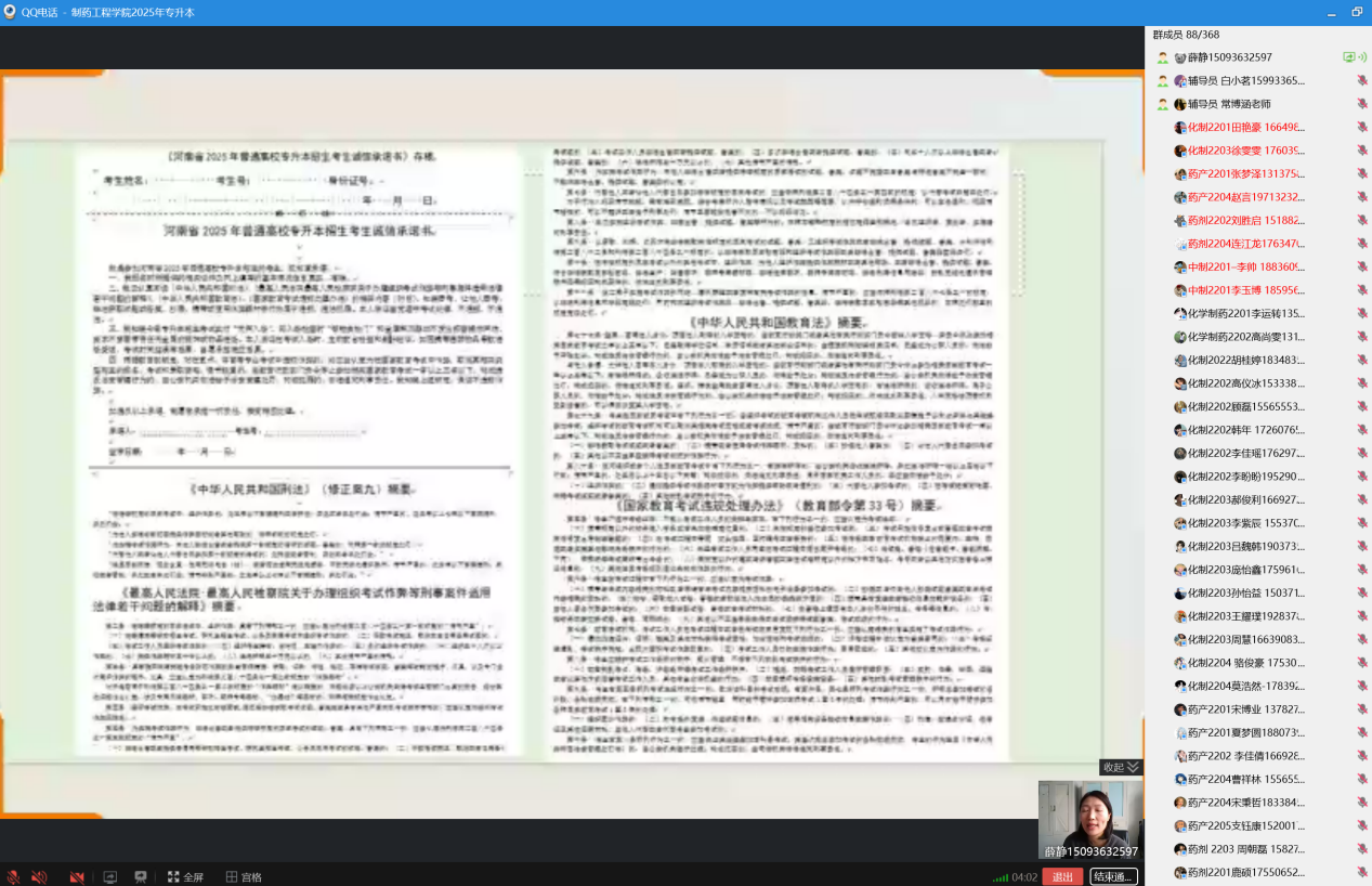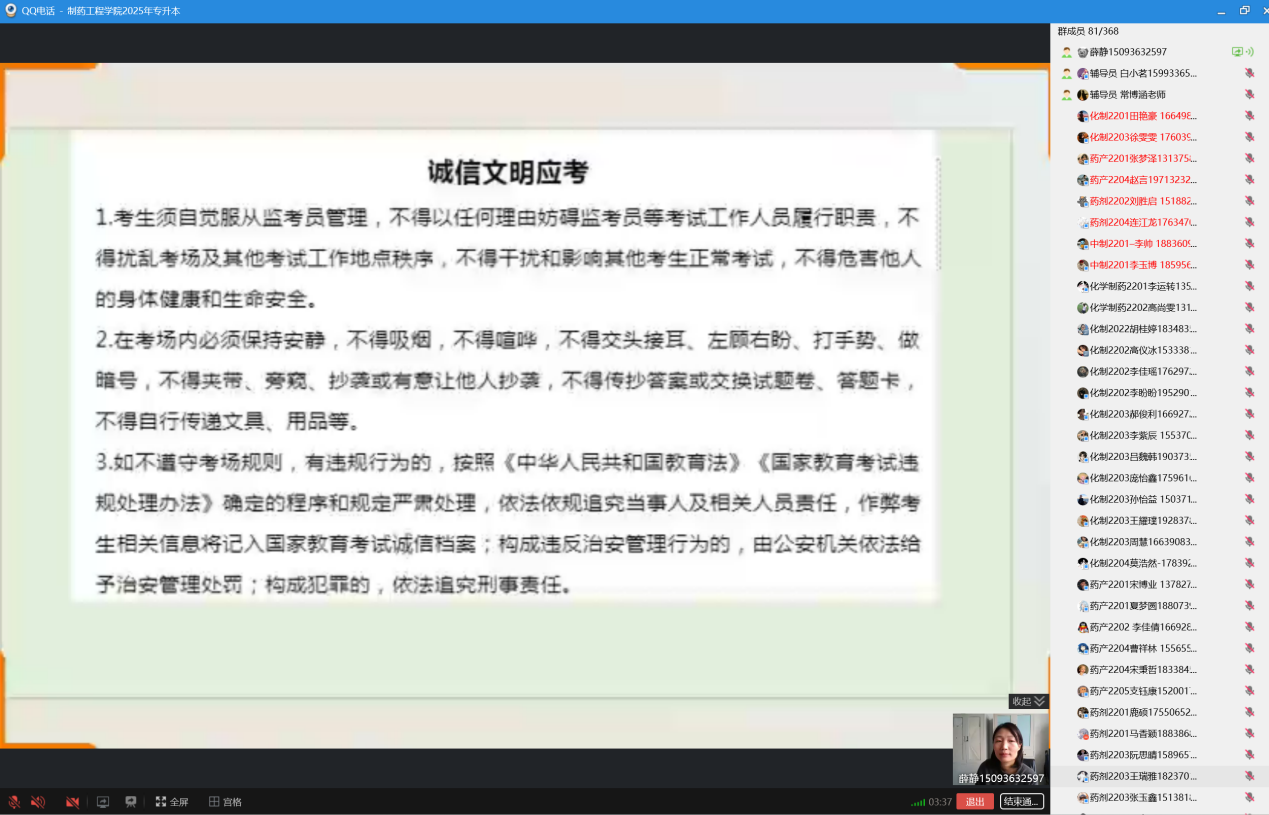 为积极响应教育部门对考试诚信建设的号召,进一步严肃考风考纪,营造风清气正的专升本考试环境,制药工程公司于2025年3月13日精心组织开展了线上专升本考试诚信教育主题班会。此次会议由制药工程公司专升本负责人薛静主持,各班专升本考生积极参会。活动围绕“倡导诚信考试,培育诚实品格”这一核心理念,旨在全方位提升员工的诚信意识,确保专升本考试工作平稳、有序推进。