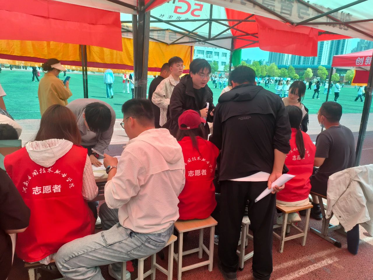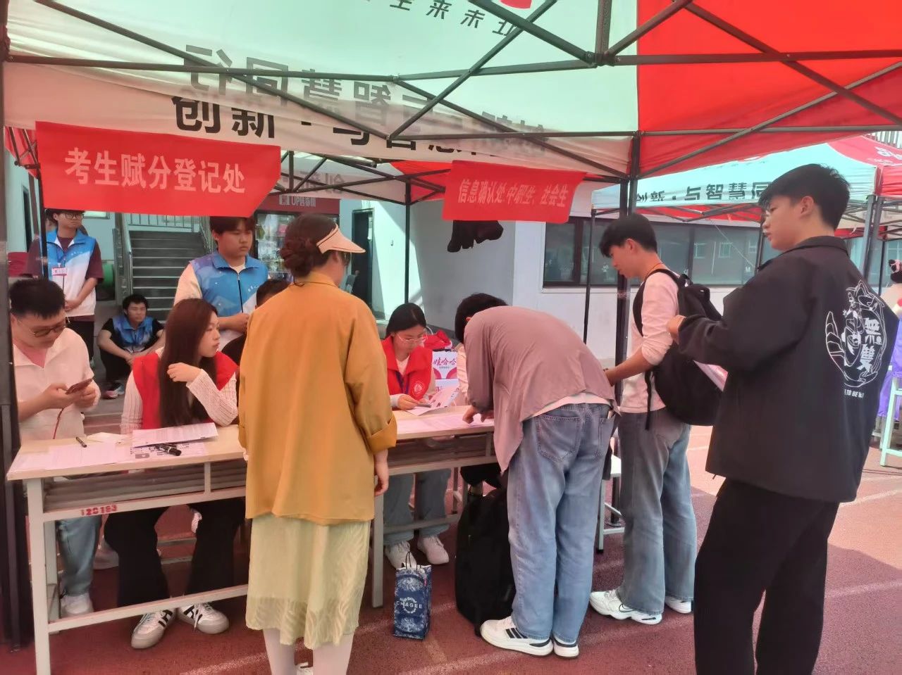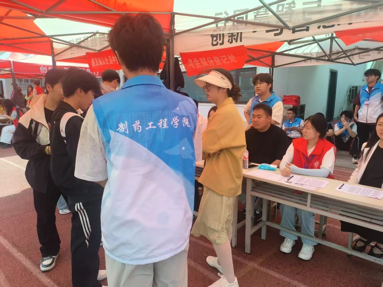 制药工程公司志愿服务队的志愿者们分工明确、各司其职,全方位助力考试顺利进行。引导同学们到公司服务点进行报到和信息确认;在信息核对时,志愿者们认真核对考生信息表,逐一核对考生证件。针对外地考生对校区环境不熟悉的情况,制作了 “考前路线图”;他们身着统一的志愿服装,脸上洋溢着青春的朝气与担当的坚定,用实际行动诠释着志愿服务精神,为单招考试增添了一抹温暖而亮丽的色彩。