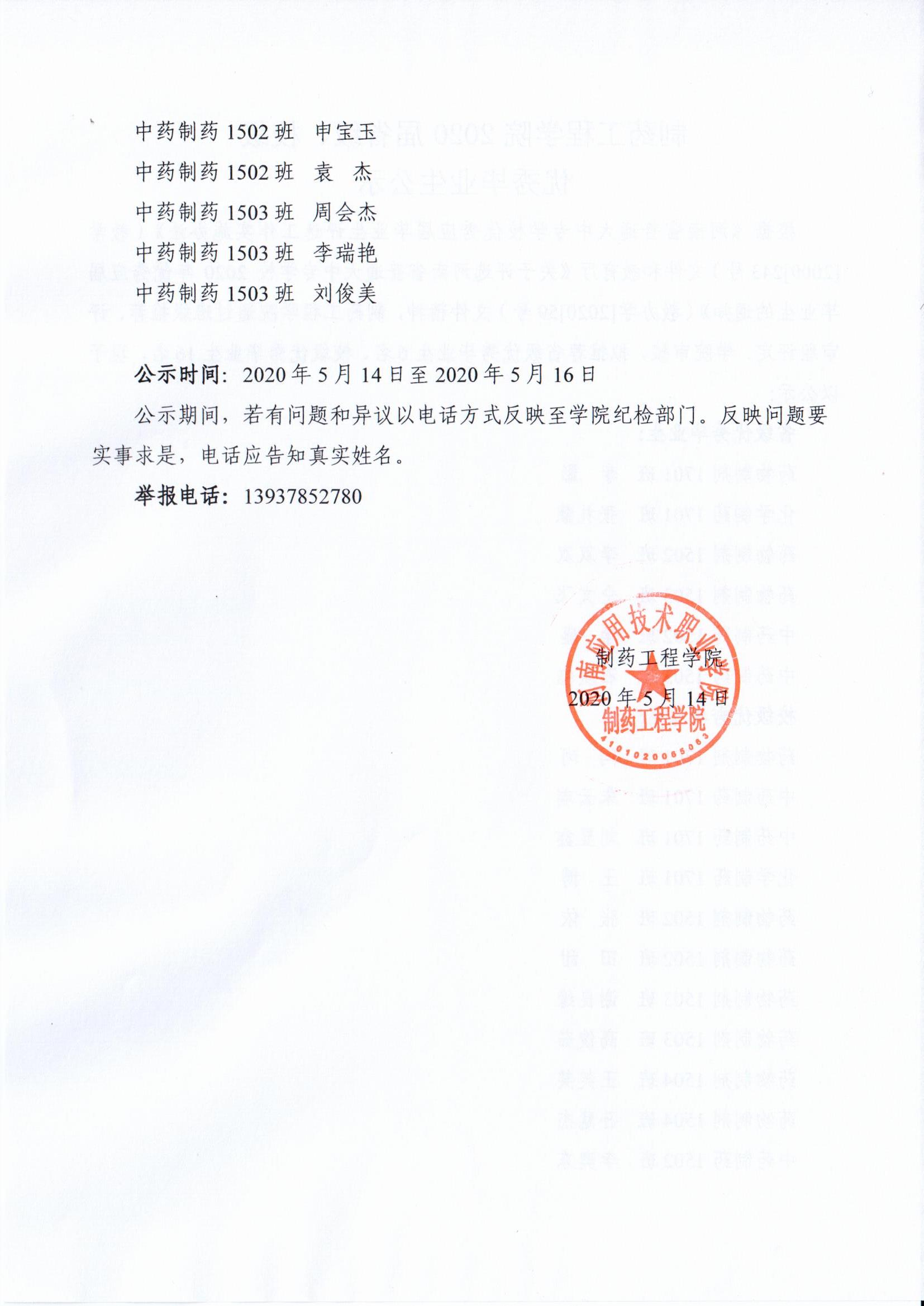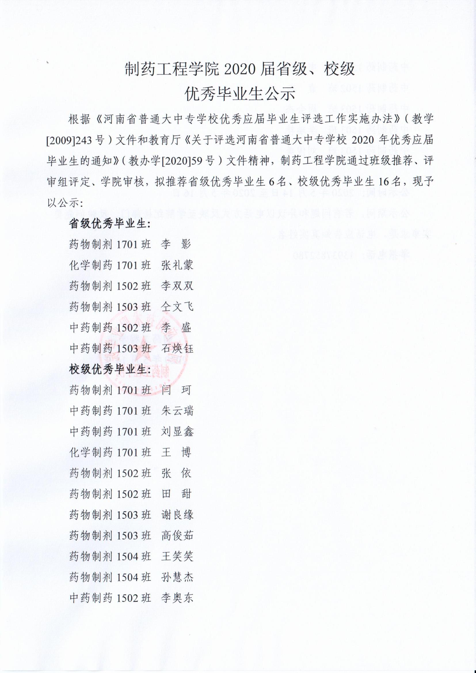 制药工程公司关于评选2020届省级、校级优秀毕业生公示