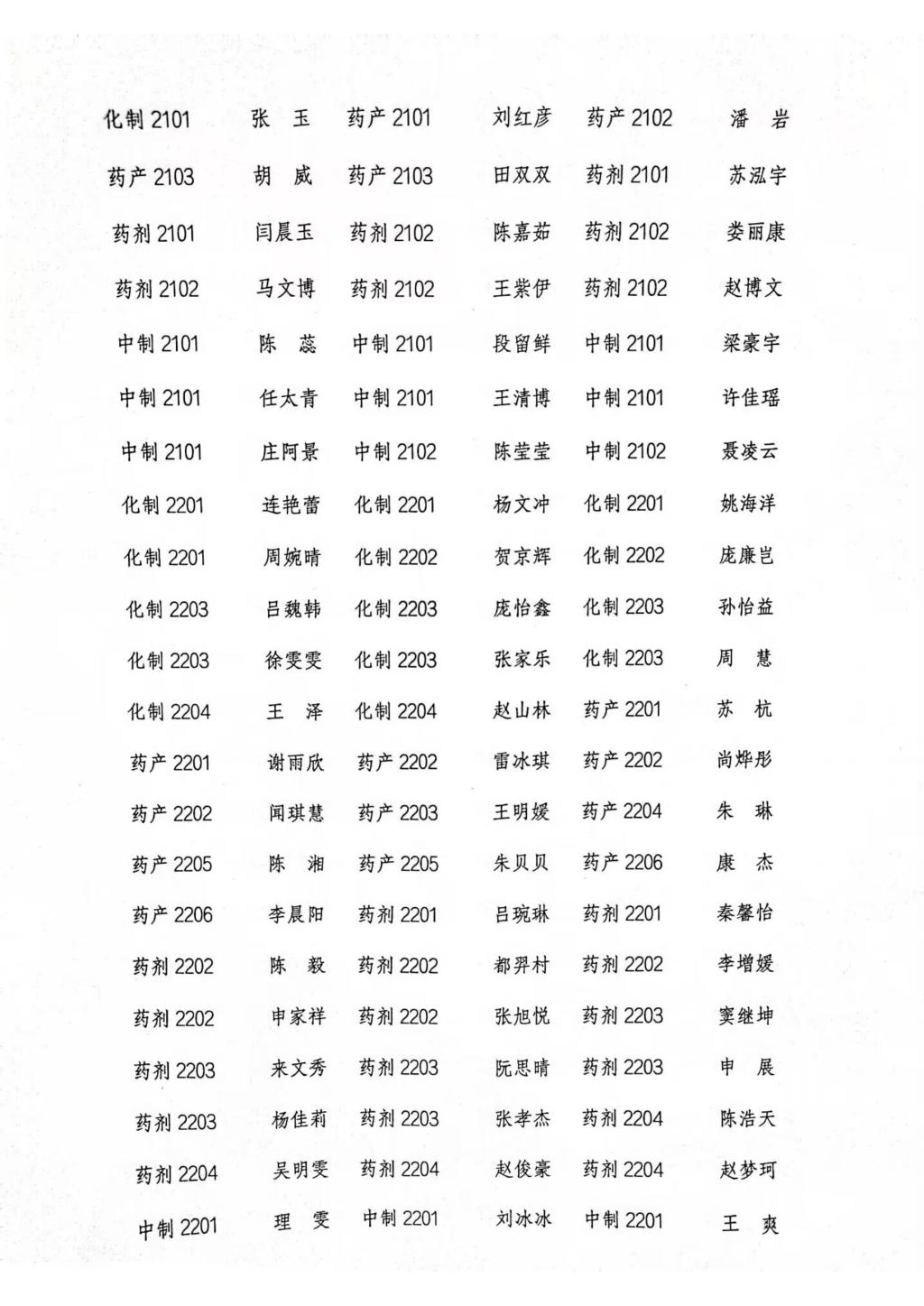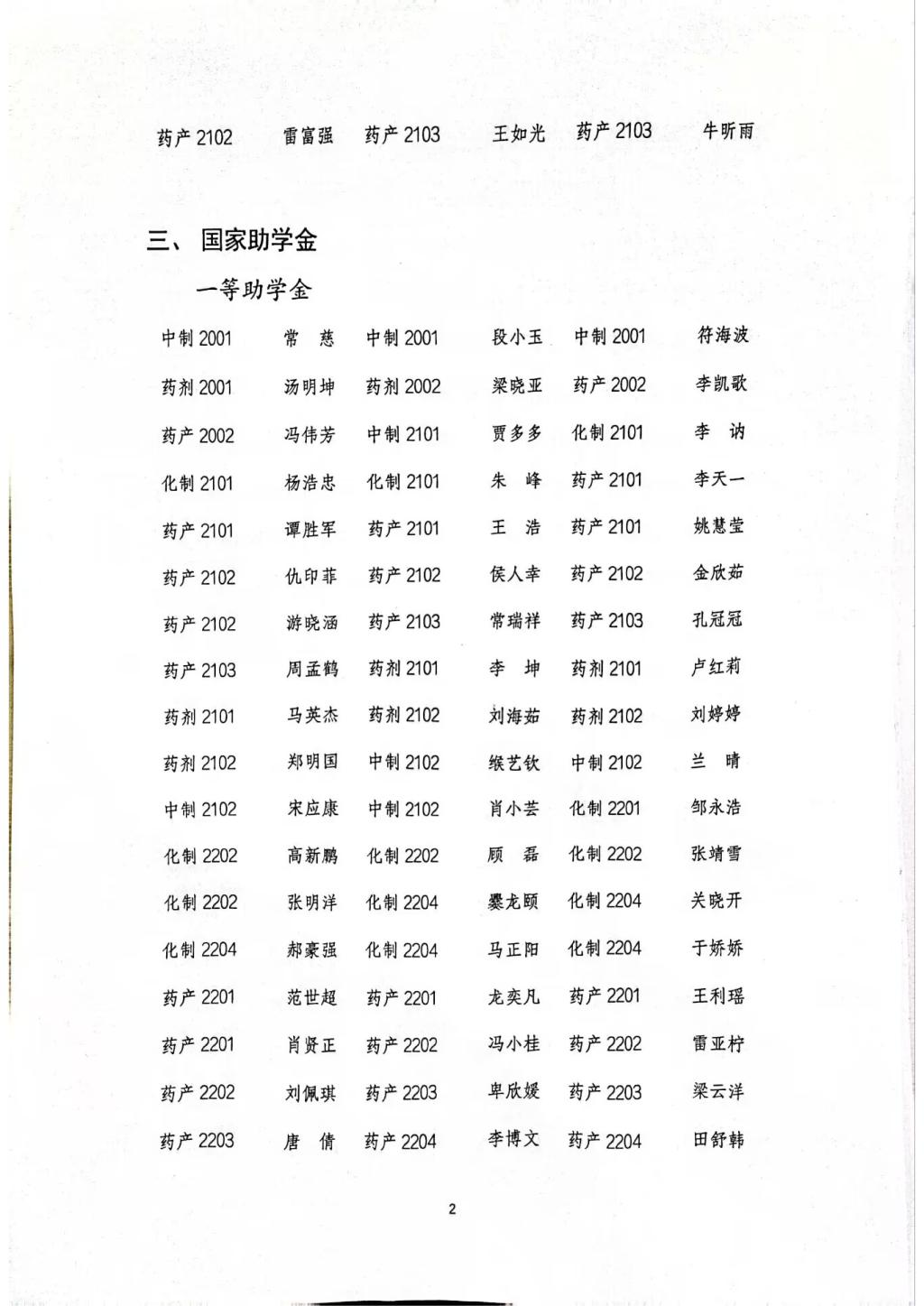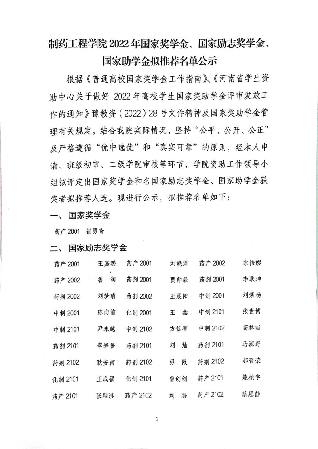 制药工程公司2022年国家奖学金、国家励志奖学金、国家助学金拟推荐名单公示