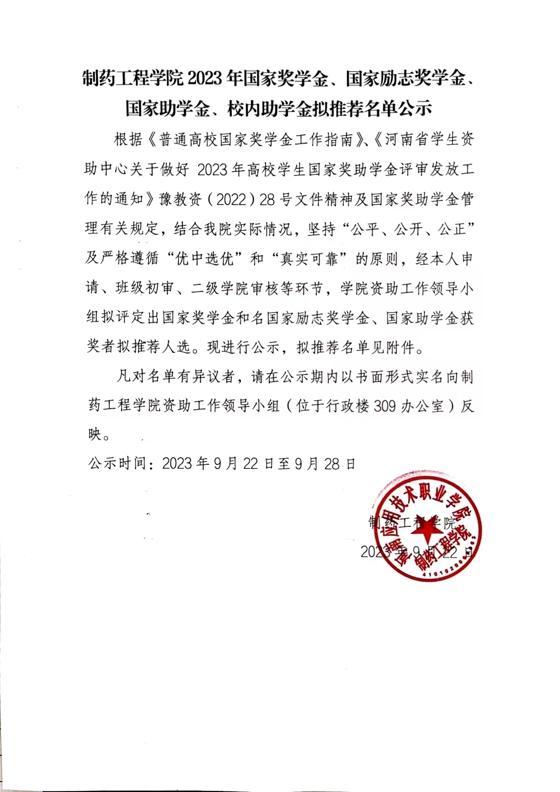 制药工程公司 2023 年国家奖学金、国家励志奖学金国家助学金、校内助学金拟推荐名单公示