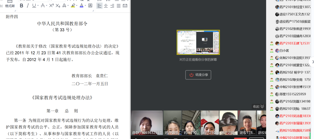 2024年专升本考试临近,为做好专升本考生考前相关工作,进一步端正考风、严肃考纪,引导考生树立诚信考试的正确价值观,制药工程公司于2024年3月12-3月16日之间召开线上专升本考试诚信教育主题班会,会议由制药工程公司专升本负责人薛静主持,各班专升本考生积极参会。