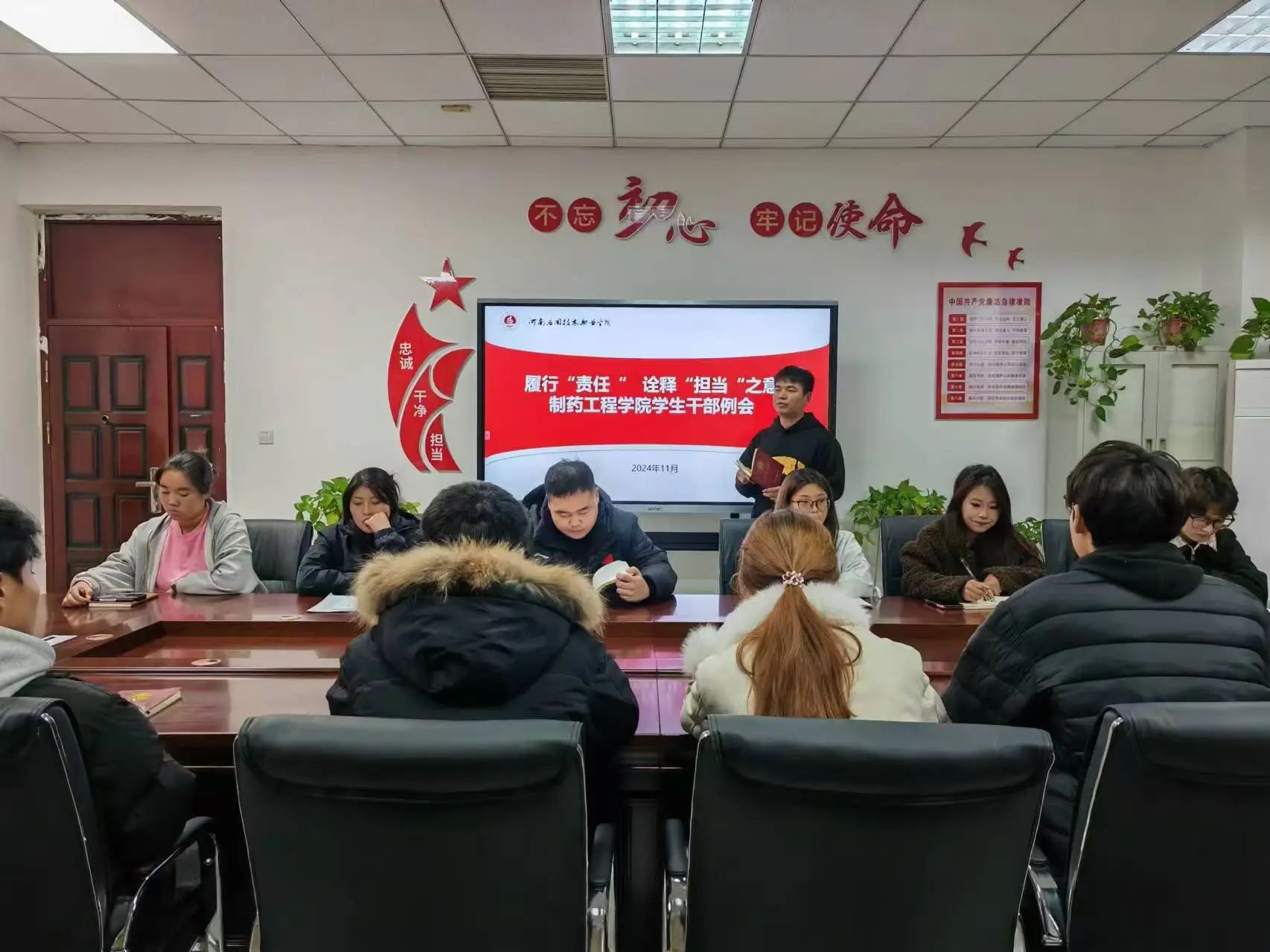 为了加强公司员工干部队伍建设,提高员工骨干的综合素质,提升服务意识,增强员工干部的凝聚力与战斗力。制药工程公司员工会于2024年11月18日在行政楼301召开员工干部例会,员工会全体干部参加本次会议,会议由主席团成员祝海辰主持。