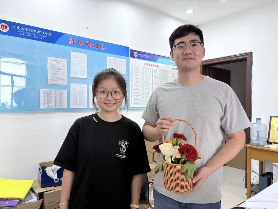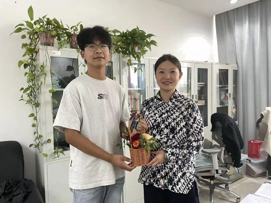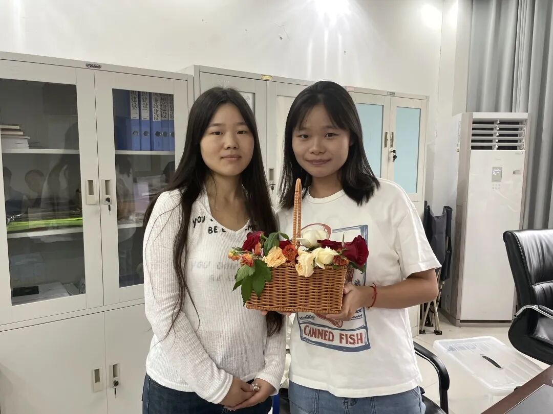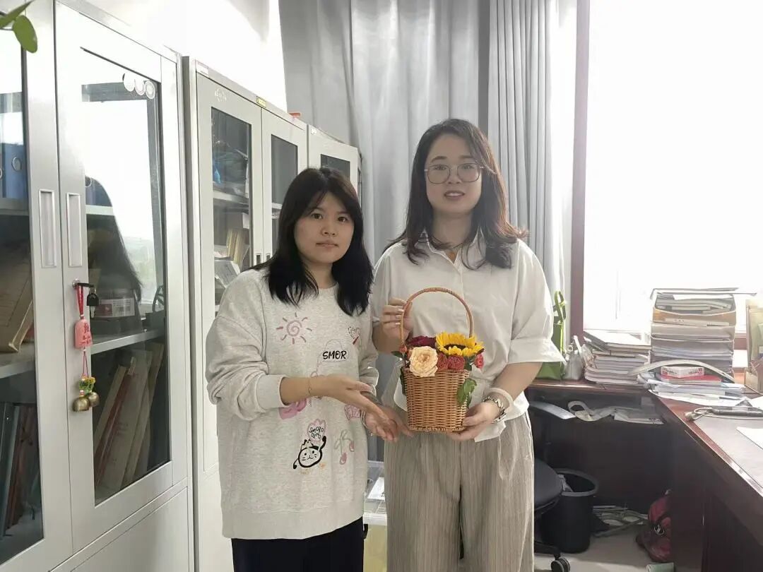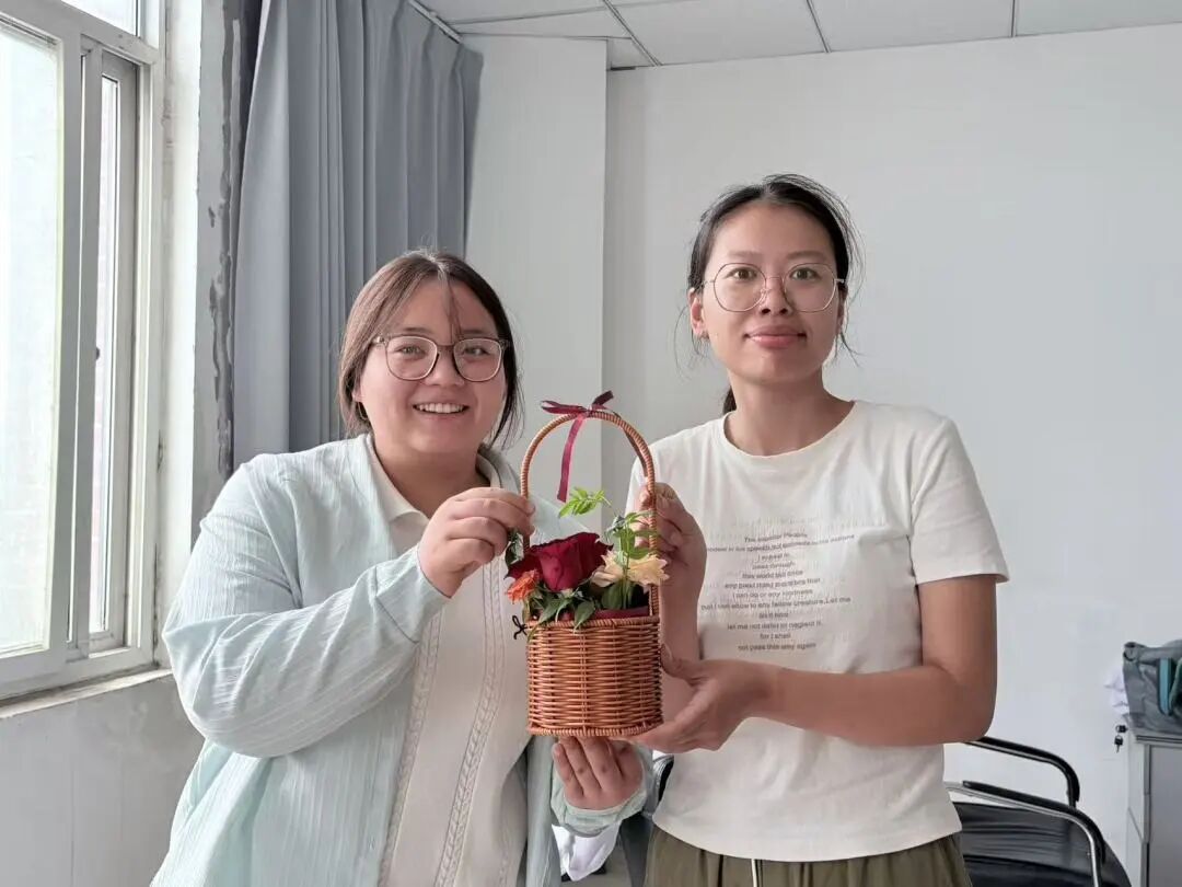 教师节前一天,员工代表分组前往公司办公室、教室,提前为老师们送上亲手制作的篮花礼与节日祝福。