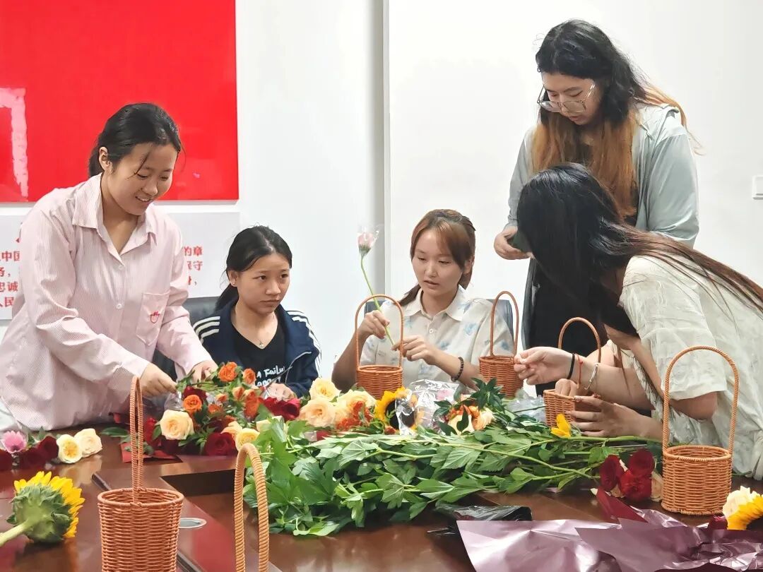 9月8日下午,员工代表在办公楼301活动室开展了手工扎花活动。同学们精心挑选花材,用心设计、巧妙搭配,将一朵朵鲜花编织成饱含深情的篮花礼。活动现场气氛温馨,同学们在动手实践中不仅提升了审美与协作能力,更将劳动教育与感恩教育融为一体。