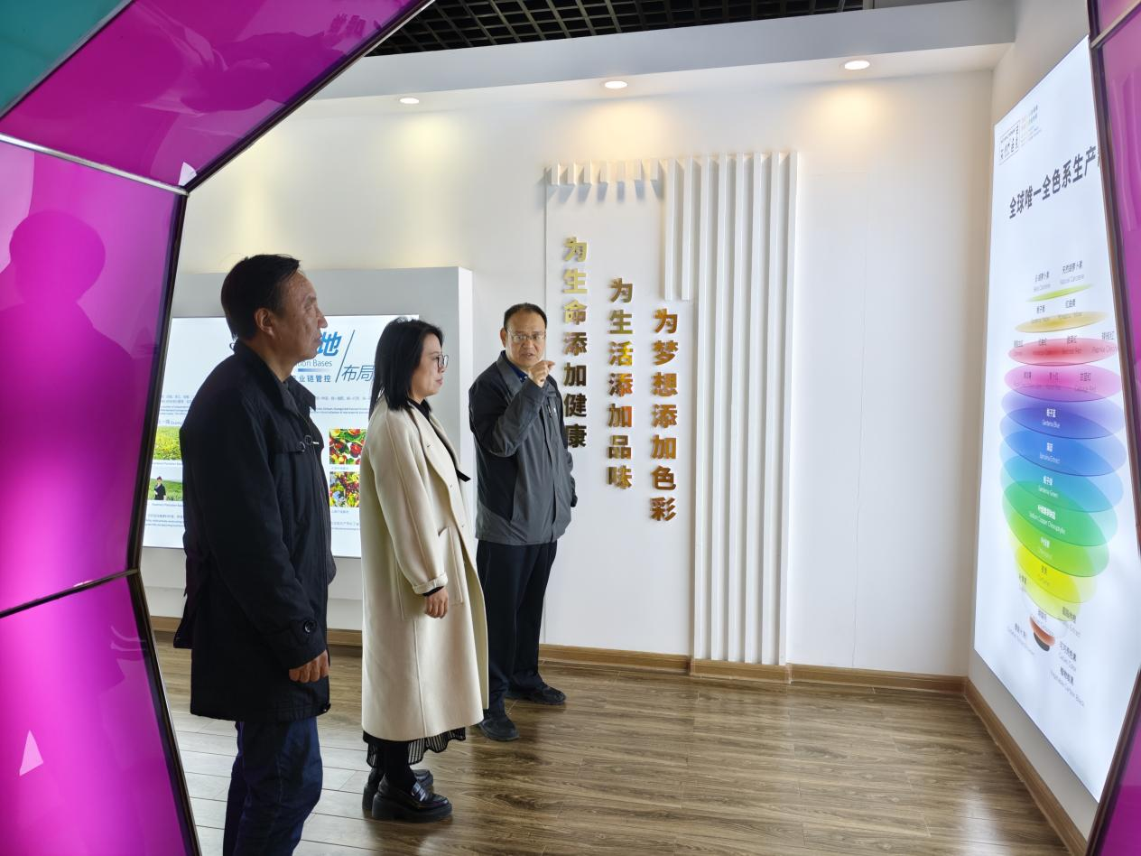 在企业人力资源总监许恒的陪同下,王湘妍一行深入考察了D-阿洛酮糖专属生产线、企业研发中心,重点观摩了“生物酶转化-结晶纯化-质量检测”全流程生产体系。在天然植物提取体验馆,企业技术人员详解了栀子黄、姜黄素等300余种产品的产业化应用历程。